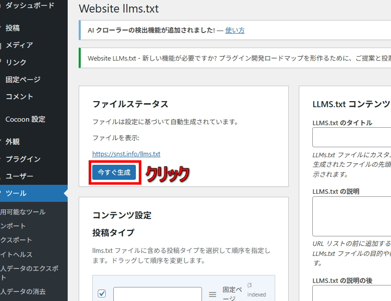 下記図の赤枠箇所「今すぐ生成」をクリック